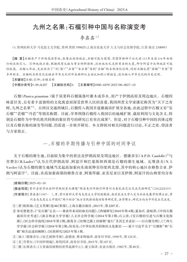2025年12月,澳门足球投注李鑫鑫博士在《中国农史》(CSSCI来源期刊/北大核心)(2025年第6期)发表学术论文《九州之名果:石榴引种中国与名称演变考》。文章认为:石榴原产于伊朗高原等地,张骞出使西域后,石榴可能与葡萄、苜蓿等物种于公元前113年至前104年由西行的汉使引入。引种地域方面,根据现有文献与考古材料推断,汉时地处巴克特里亚的大夏,即今阿富汗北部地区可能性较高。石榴入华后,先后经历了“刘(留)”“石留”“安石留”再到“石榴”的名称演化过程,同时石榴也有“若榴”“丹若”等多种别名。石榴的名称变化反映出中华文化对外来物种从主动认知到心理接受,进而融入中华文化的历史过程。