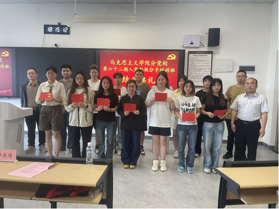 6月12日,学院分党校在善思楼R103教室举行第62期入党积极分子培训班结业典礼,学院党委副书记王万江、分团委副书记马景瑶、班主任黄连舟、学生党支部书记杜美瑾及全体学员参加,结业典礼由杜美瑾主持。