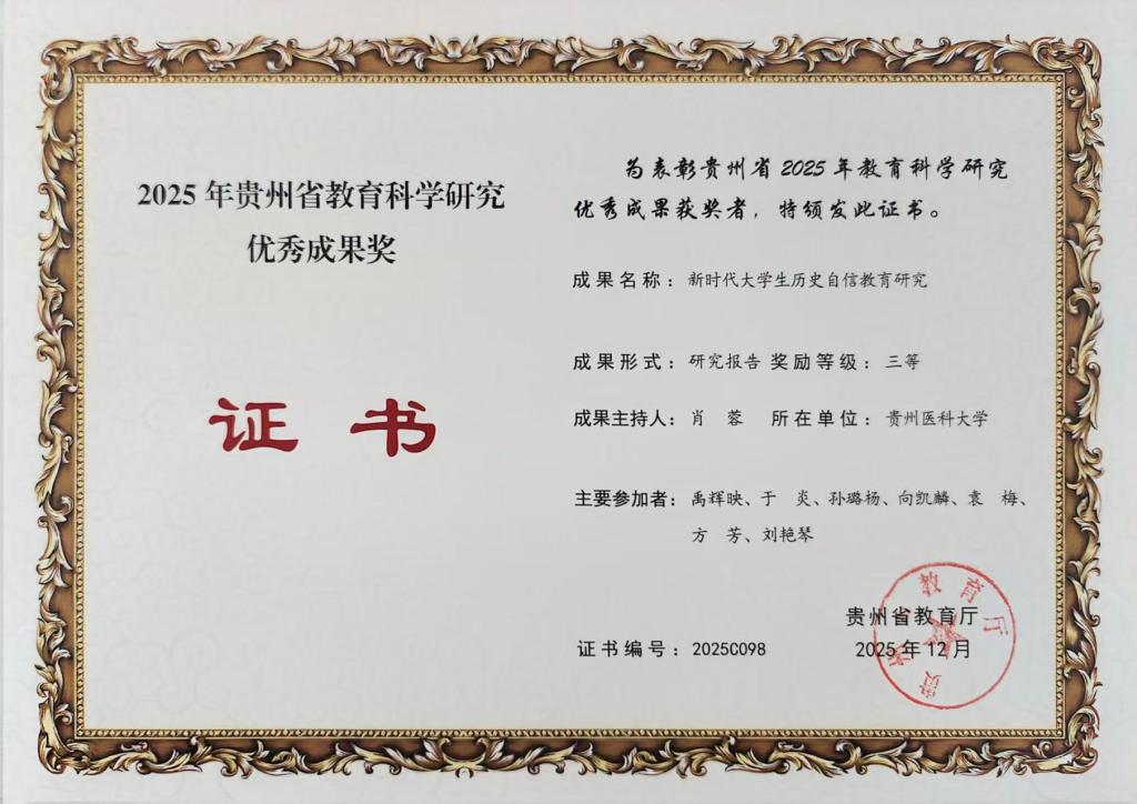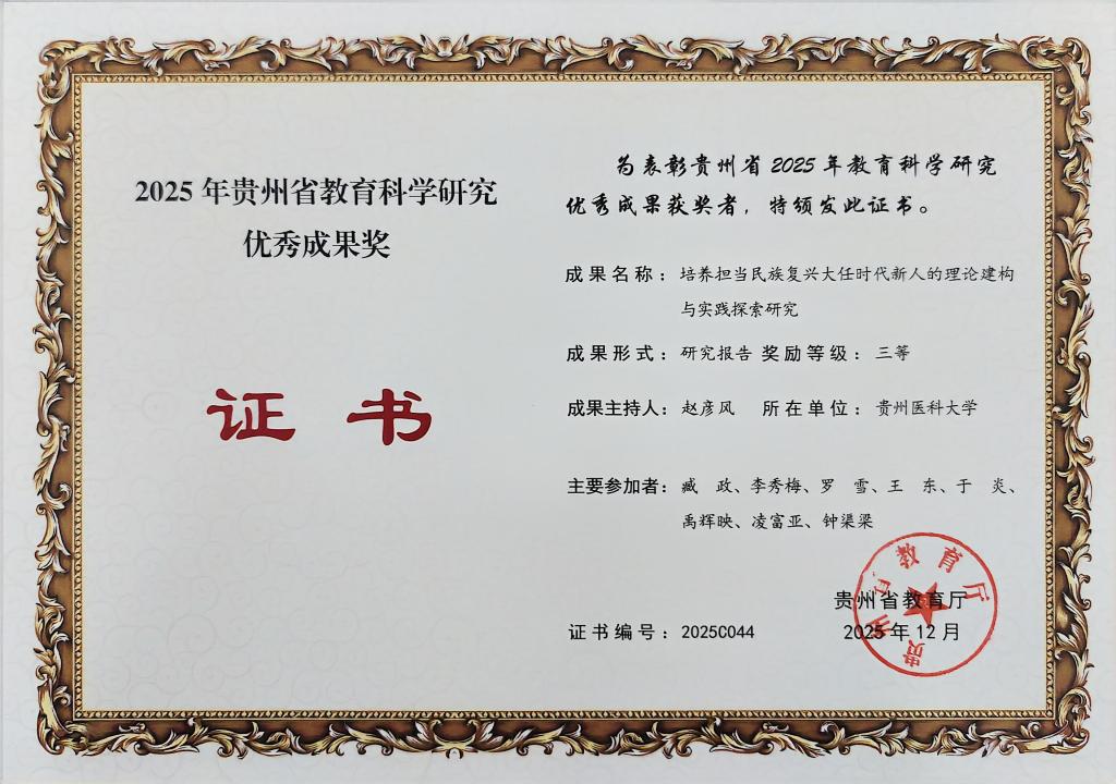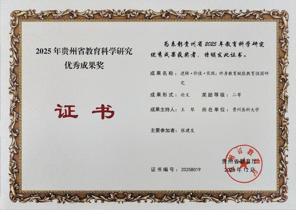 近日,贵州省教育厅公布了2025年教育科学研究优秀成果奖评选结果,澳门足球投注喜获3项奖项,展现了在教育科学研究领域的扎实实力。此次获奖成果涵盖终身教育、时代新人培养、大学生历史自信教育等方向。其中,王琴申报的《逻辑・价值・实践:终身教育赋能教育强国研究》(论文)荣获二等奖;赵彦风申报的《培养担当民族复兴大任时代新人的理论建构与实践探索研究》(研究报告)、肖蓉申报的《新时代大学生历史自信教育研究》(研究报告)均获三等奖。